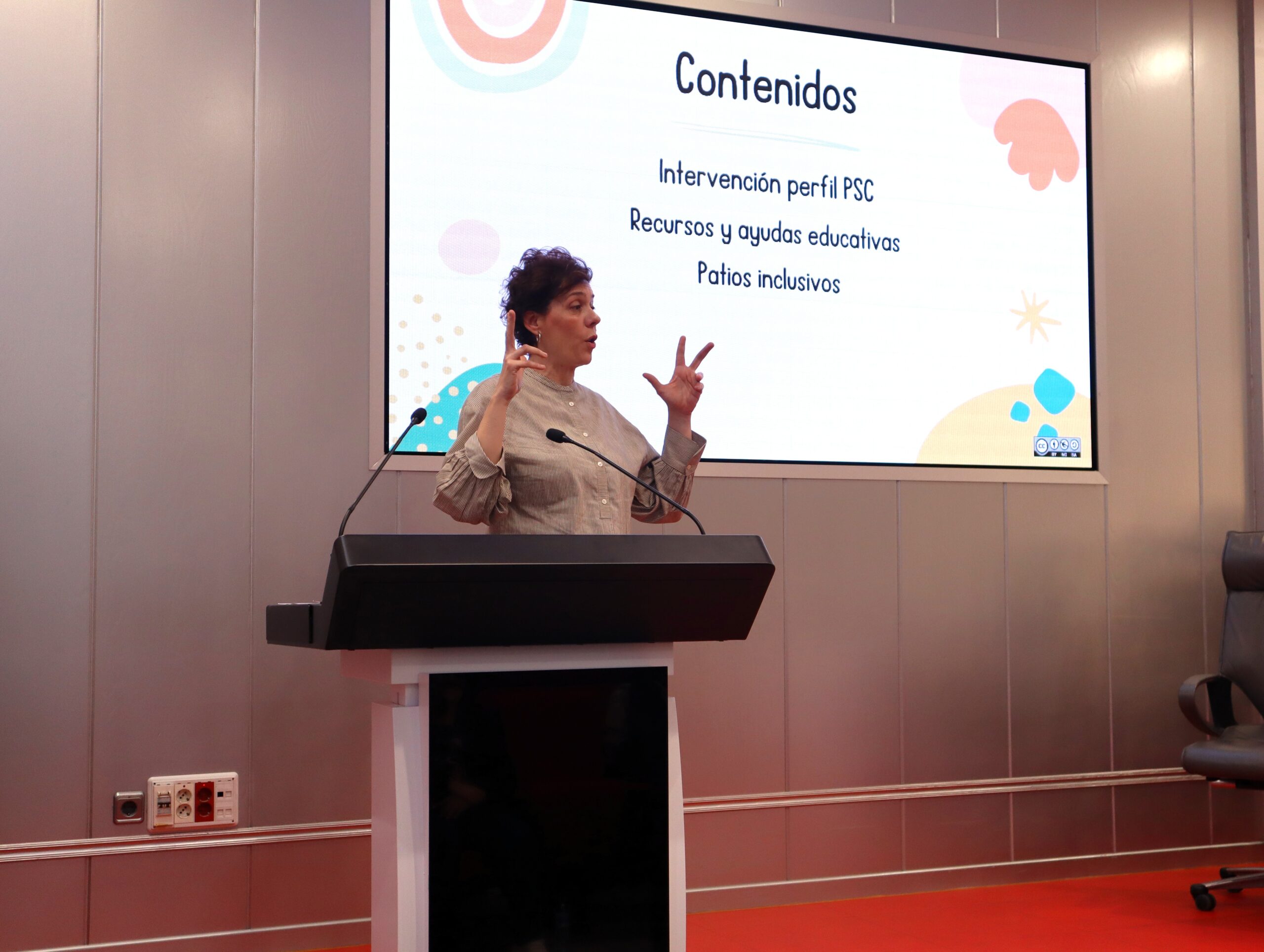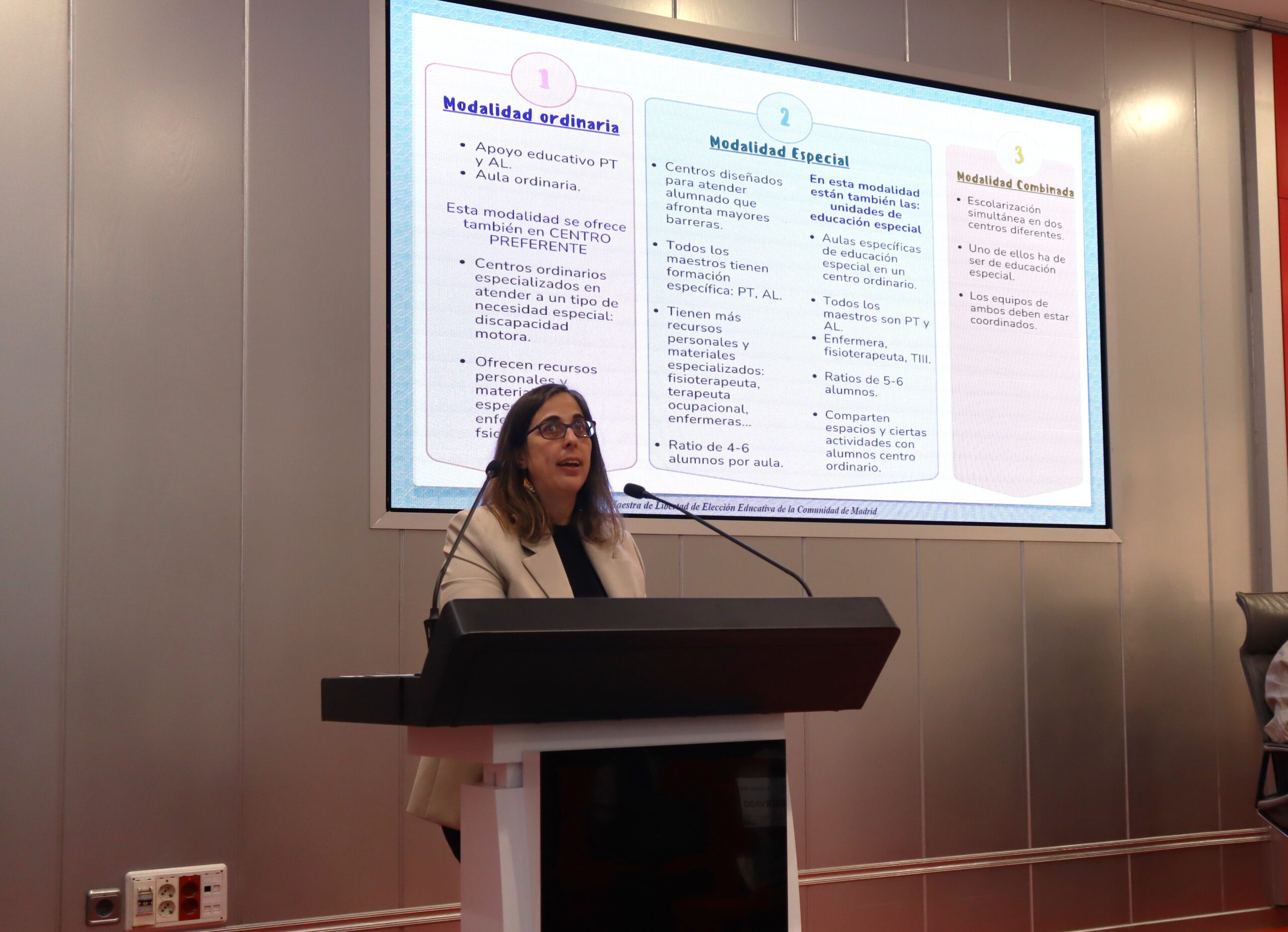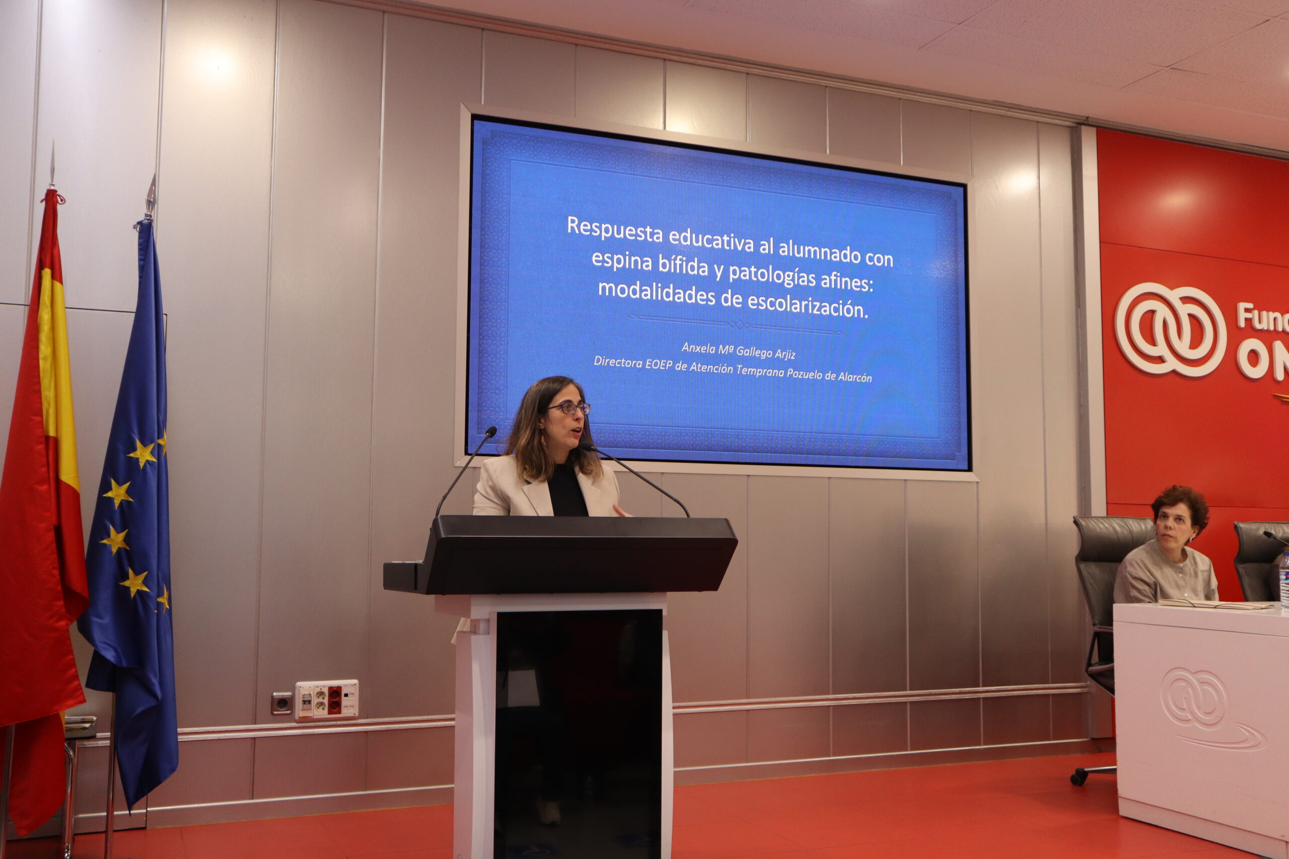 La primera mesa, moderada por Ánxela Gallego, directora del Equipo de Orientación Educativa y Psicopedagógica de Atención Temprana de Pozuelo-Majadahonda y socia de AMEB, abordó las modalidades de escolarización, adaptaciones curriculares, ayudas educativas y la importancia de espacios inclusivos como patios y entornos seguros.