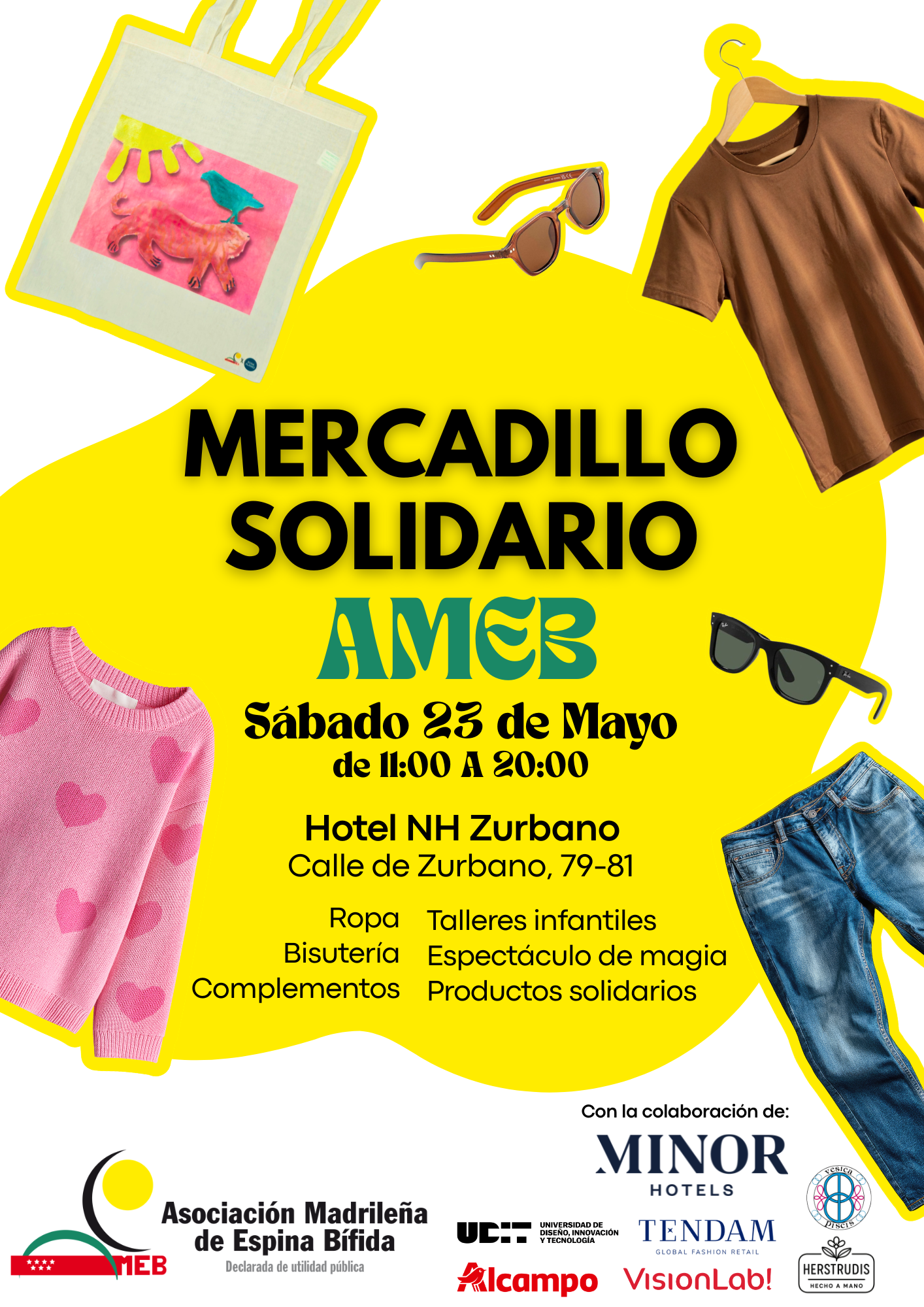 Un mercadillo solidario donde podrás encontrar ropa, accesorios, complementos de primeras marcas y productos solidarios de AMEB, con el objetivo de recaudar fondos para mejorar la calidad de vida de las personas con espina bífida y otras discapacidades que forman parte de la misma.