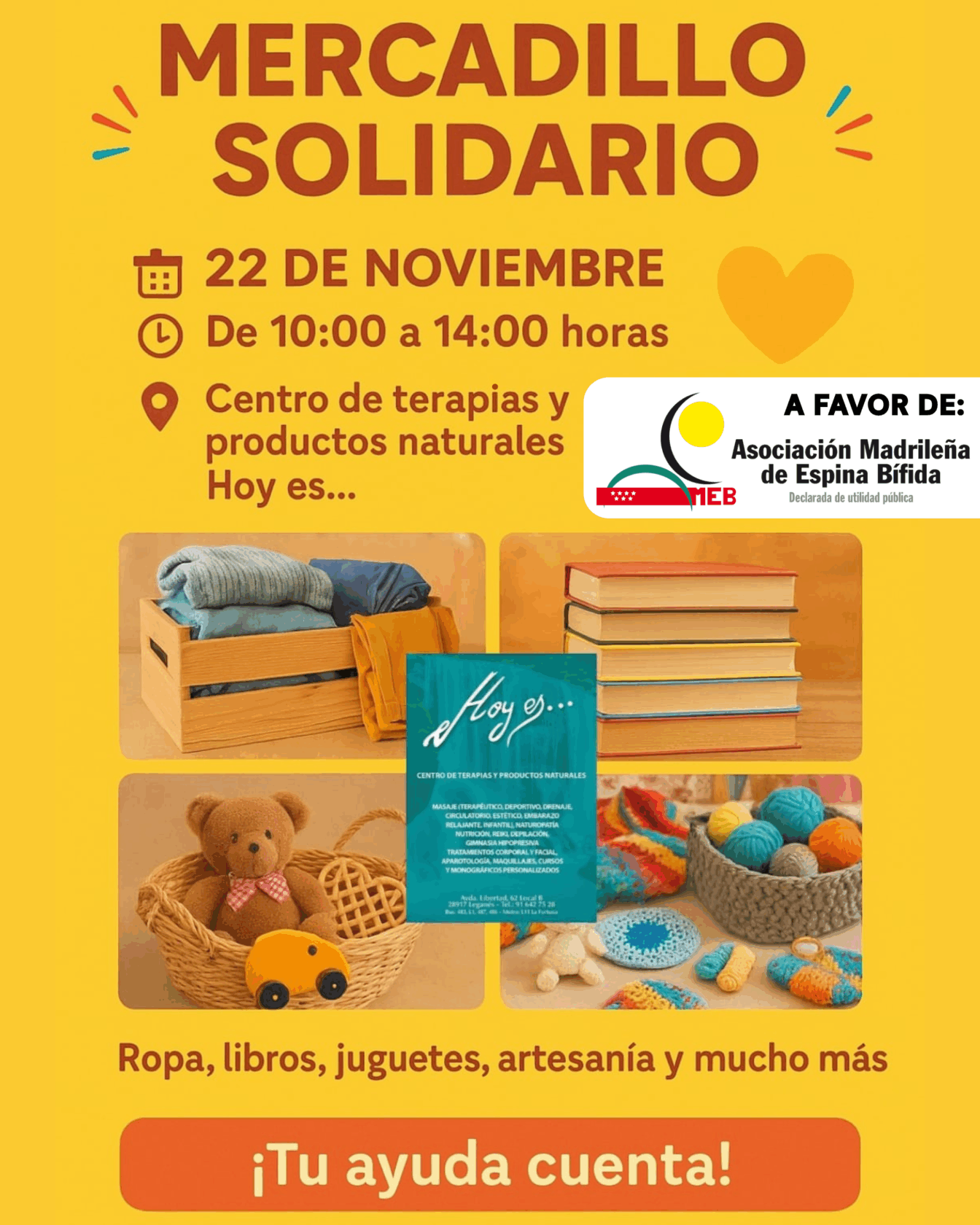 El sábado 22 de noviembre, el Centro de Terapias y Productos Naturales Hoy es organizó un mercadillo solidario lleno de artesanía, ilusión y compromiso. Se pusieron a la venta productos artesanales, ropa, pequeños electrodomésticos y varios de nuestros artículos solidarios.